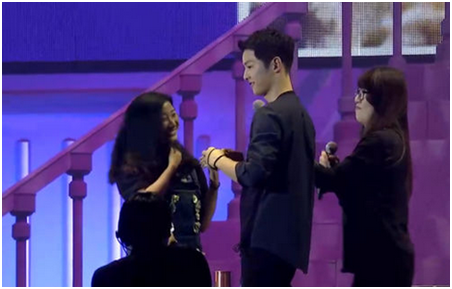 一身酷酷的黑套装,,,,一曲温暖深情的《好久不见》,,宋仲基以标准的中文演唱开启了粉丝见面会的第二部分互动。。。作为粉丝见面会现场游戏互动当然必不可少,,,,仲基欧巴现场亲自邀请热情粉丝一起还原《太后》浪漫场景,,拥抱、、、、系鞋带、、、、绑头发、、、遮太阳....5位幸运粉丝激动的心情,,,,幸福的表情,,,,现场摄影师拍下亲密瞬间,,,并由宋仲基现场签名赠送。。。。