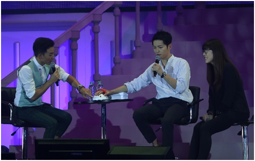 在长达两个小时的时间里,,,宋仲基一直风趣幽默的和粉丝亲密沟通互动,,“给力”“完美”“吃饱了”都毫无压力的从仲基欧巴的口中说出,,更是频繁的提到了李光洙欧巴,,,,这么看来他可谓是仲基欧巴吃喝玩乐工作外出的居家必备!!!!《太后》的经典桥段也是不出所料的出现在见面会中,,特别的是其中三个经典桥段是宋仲基亲自挑选,,,并与主持人现场角色扮演,,引来粉丝尖叫连连!!