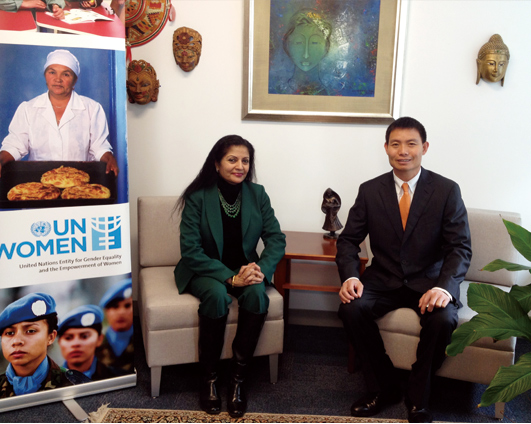 此外,,纽约时间3月5日上午,,联合国总部官员还在会前特邀方玉友先生,,,,共同探讨企业如何以创新思维帮助女性迎接职场挑战。。。妇女署执行副主任Lakshmi Puri女士热情地为方玉友先生介绍了诸多解决女性就业挑战的国际潮流思路。。。